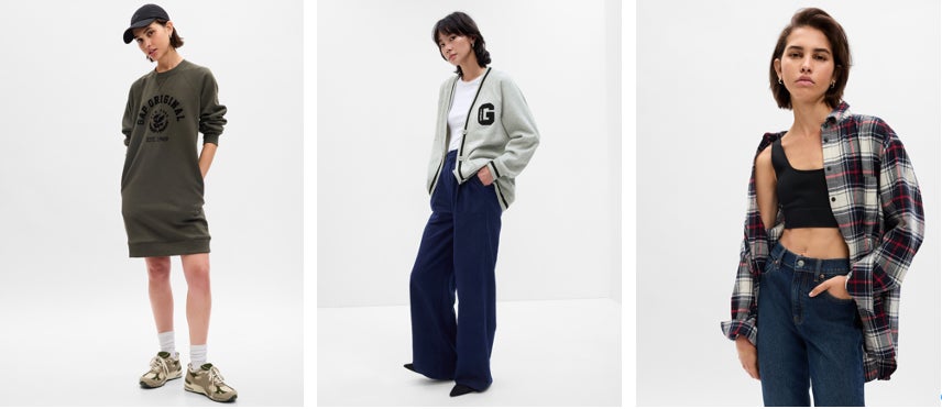 ウィメンズは、旬なデザインのスウェットが充実。定番のAUTHENTICロゴプルオーバーや、様々なデザインのGAPロゴが施されたロング丈スウェットドレス、プレッピーな風合いのワンポイントロゴカーディガンが登場。さらに、今秋からウィメンズカテゴリーでも新たに展開するビッグシルエットのフランネルシャツは、柔らかな100%コットンを採用し全5色で揃います。